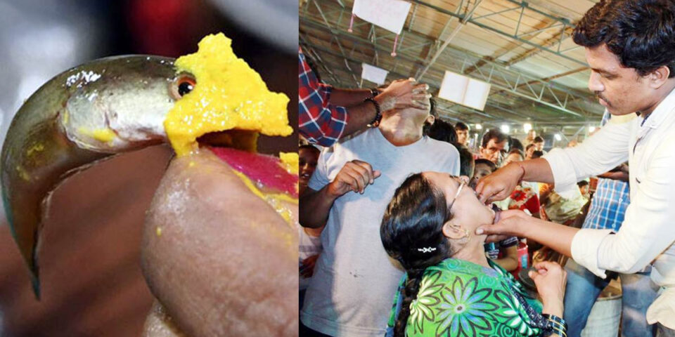 చేపపిల్లను నోటిపై ఉంచుతారు మరియు శ్వాసనాళ సంబంధిత వ్యాధులతో బాధపడేవారు దానిని పూర్తిగా మింగేస్తారు.