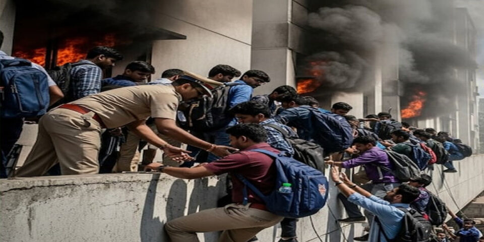 దట్టమైన పొగ అలుముకోవడంతో విద్యార్థులు బాల్కనీల్లో చిక్కుకుపోయారు. అగ్నిమాపక సిబ్బంది లాడర్లు (నిచ్చెనలు), బ్రోంటో స్కైలిఫ్ట్ మరియు ఫేస్ మాస్క్ల సహాయంతో వారిని రక్షించారు.