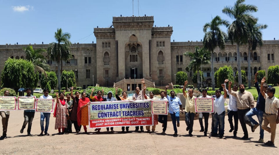 తమను రెగ్యులరైజ్ చేయాలని కోరుతూ ఓయూ ఆర్ట్స్ కళాశాల ముందు కాంట్రాక్ట్ అసిస్టెంట్ ప్రొఫెసర్లు ఒంటి కాలిపై నిలబడి శనివారం నిరసన వ్యక్తం చేశారు. అలాగే తమ సర్వీసులను రెగ్యులరైజ్ చేయాలని సూచించే ప్లకార్డులను వారు ప్రదర్శించారు. ఈ సందర్భంగా ఓయూ కాంట్రాక్ట్ అసిస్టెంట్ ప్రొఫెసర్ల జేఏసీ కన్వీనర్ డాక్టర్ డి ధర్మతేజ మాట్లాడుతూ గత రెండు మాసాలుగా వివిధ రూపాల్లో తాము ఆందోళన కార్యక్రమాలు చేపడుతున్నామని అయినప్పటికీ రాష్ట్ర ప్రభుత్వము స్పందించకపోవడం దురదృష్టకరమన్నారు. ఇప్పటికైనా వెంటనే తమ రెగ్యులర్రైజేషన్ పై ప్రకటన చేసి తగిన ప్రక్రియను ప్రారంభించాలని ముఖ్యమంత్రి కేసీఆర్ కు ఆయన విజ్ఞప్తి చేశారు. లేనిపక్షంలో తమ ఉద్యమాన్ని ఉదృతం చేస్తామని తెలిపారు. అంతేకాకుండా తరగతులను బహిష్కరించి నిరవధిక సమ్మెకు దిగుతామని హెచ్చరించారు. ఈ కార్యక్రమంలో ఓయూ వివిధ కళాశాలలకు చెందిన కాంట్రాక్ట్ అసిస్టెంట్ ప్రొఫెసర్లు డాక్టర్ అయోధ్య కవితా రెడ్డి, డాక్టర్ వినీత పాండే, డాక్టర్ దీకొండ తిరుపతి, డాక్టర్ విజయ్, డాక్టర్ మోడెం రవి, డాక్టర్ శంషుద్దీన్, డాక్టర్ ఆరూరి మహేందర్ తదితరులు పాల్గొన్నారు.