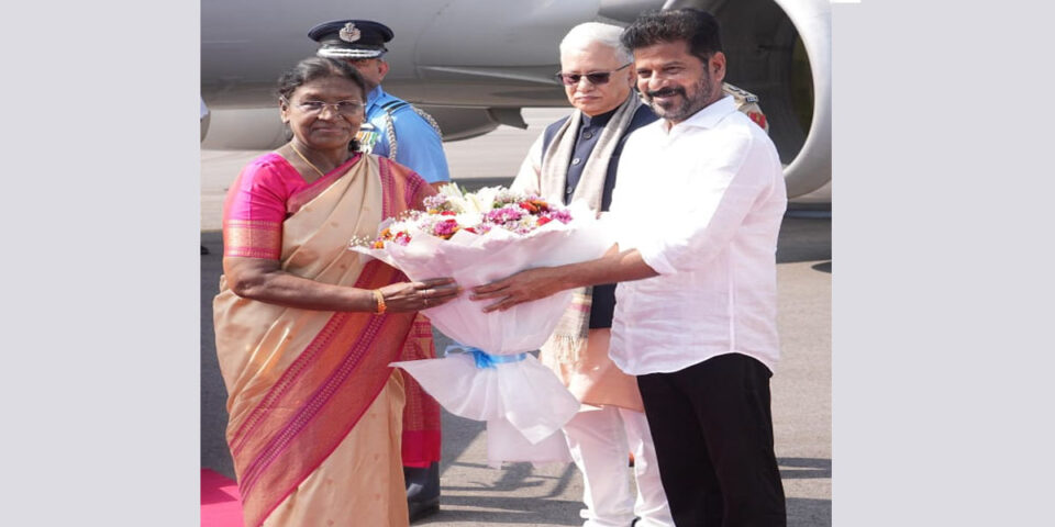 రాష్ట్ర గవర్నర్ శ్రీ జిష్ణు దేవ్ వర్మ తో కలిసి ముఖ్యమంత్రి శ్రీ ఎ. రేవంత్ రెడ్డి రాష్ట్రపతి కి స్వాగతం పలికారు.
